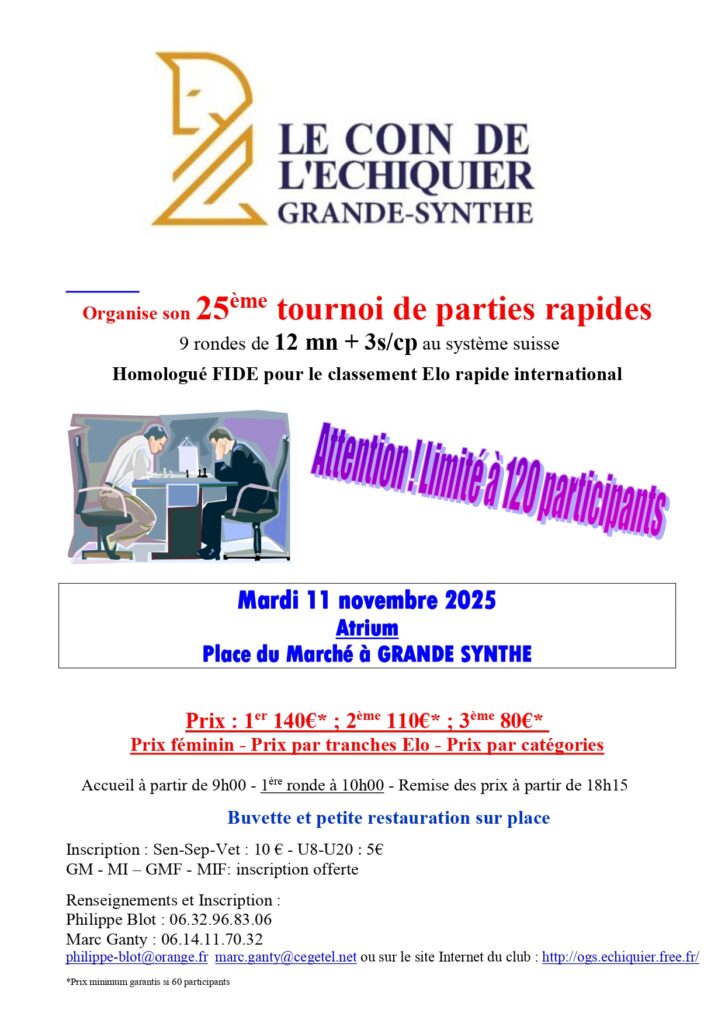 25è Tournoi de parties rapides 2025 Notre 25-ème tounoi de parties rapides aura lieu à l’Atrium, Place du Marché à Grande-Synthe. Pour les détails voir ci-dessous. Loading PDF... Error loading PDF. Please check the URL or file. − + ← 1 / 1 → ⛶ ↓ 🖨 Pré-inscription via le formulaire ci-dessous Contact Form Demo (#4)NomPrénomEmailN° FFE ou FIDE IDValider Voir en ligne : https://echecs.asso.fr/FicheTournoi.aspx?Ref=68496